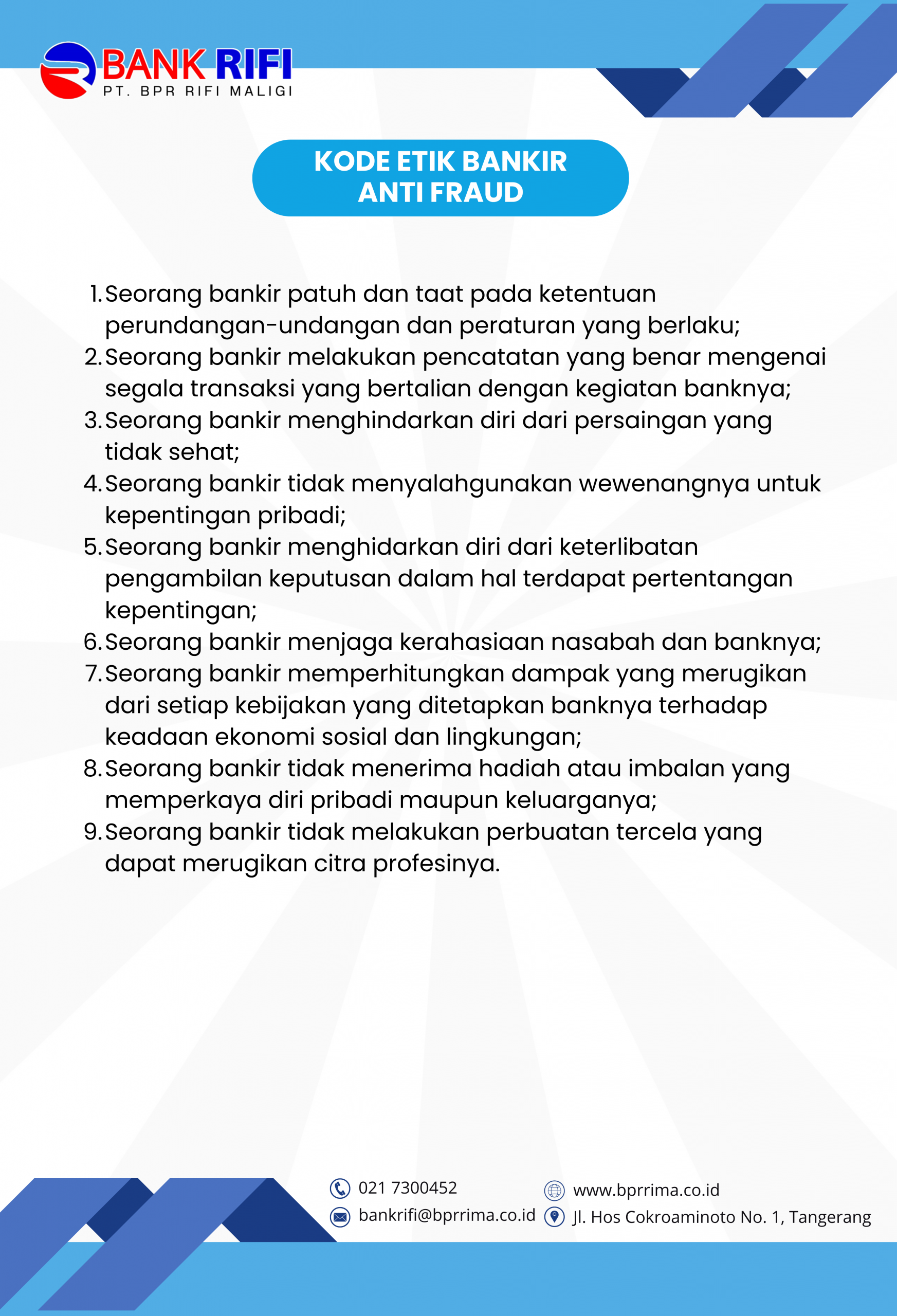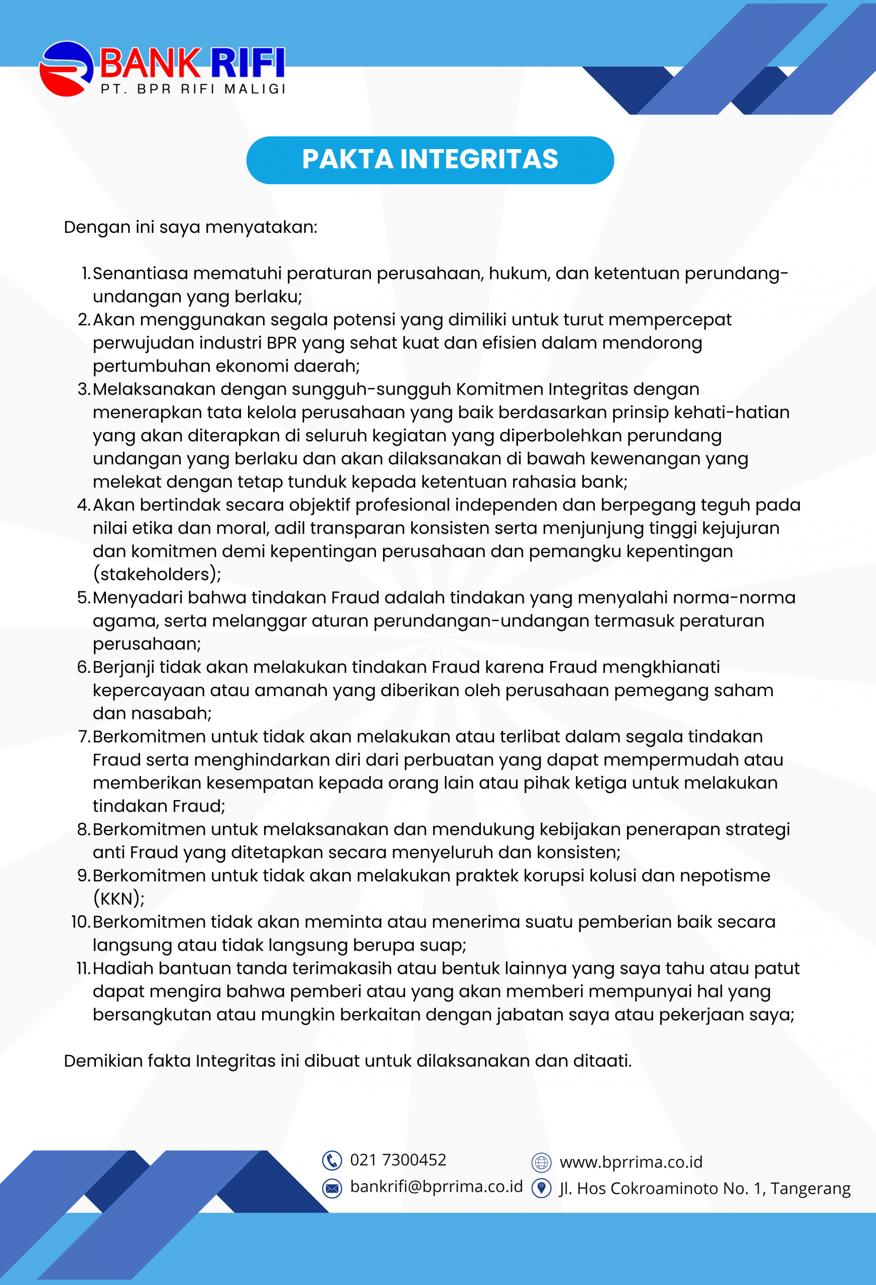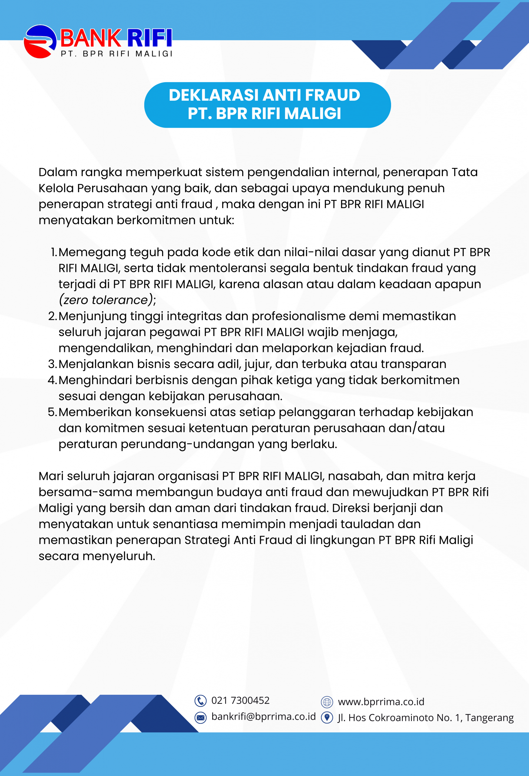 PT BPR Rifi Maligi memiliki komitmen untuk memperkuat sistem pengendalian internal, membangun budaya dan kepedulian anti-fraud di seluruh jenjang organisasi agar terciptanya tata kelola yang baik. Komitmen tersebut kami tuangkan dalam beberapa dokumen deklarasi sebagai berikut